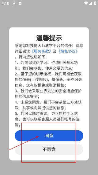 1、使用【技能大师教学平台】前需审阅【服务条款】及【隐私协议】,了解信息获取等提示后,点击【同意】即可继续使用平台服务。