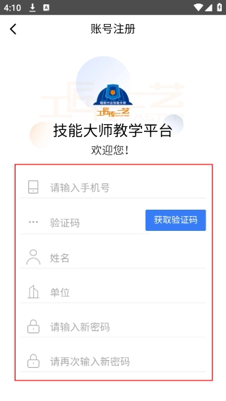 3、在【账号注册】页面,需依次填写【手机号】-获取并输入【验证码】-【姓名】-【单位】,设置并确认密码完成注册。