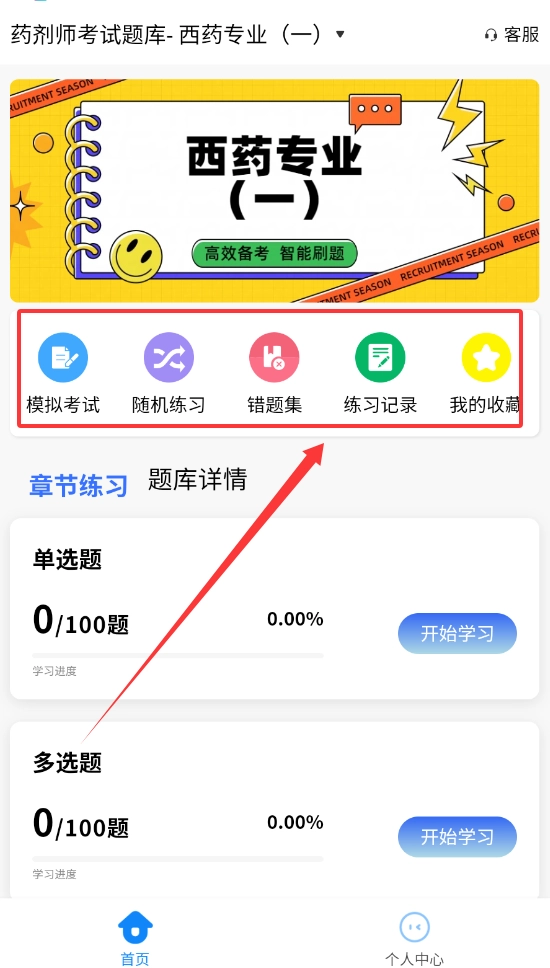 1、打开软件进入西药专业模块,主页面有模拟考试和章节练习等按钮,点击下方开始学习就能刷题了。