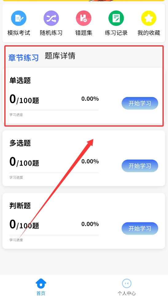 首页也能找到错题集和练习记录,方便随时回顾做错的题目以加深记忆,个人中心则可以查看学习进度。