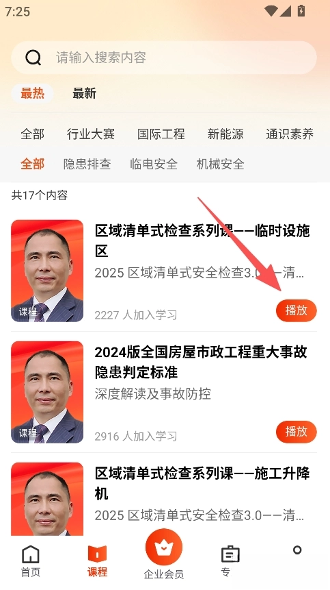 2、进入课程页,按最热、最新或分类查找课程,点击“播放”即可学习。