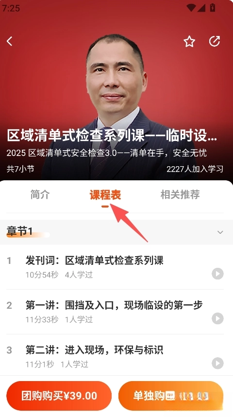 3、进入具体课程,查看课程表,选择章节学习,也可按需团购或单独购买课程。
