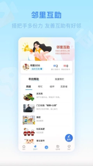 2、在互助卡模块中,居民能够发布具体的求助信息以寻求邻居的帮助,也可以主动为有需要的人提供支持。