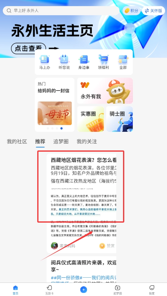 2、这里会展示丰富的邻里动态和资讯,你可以浏览像“西藏烟花表演”这类感兴趣的话题,点进去阅读全文并与邻居们互动。