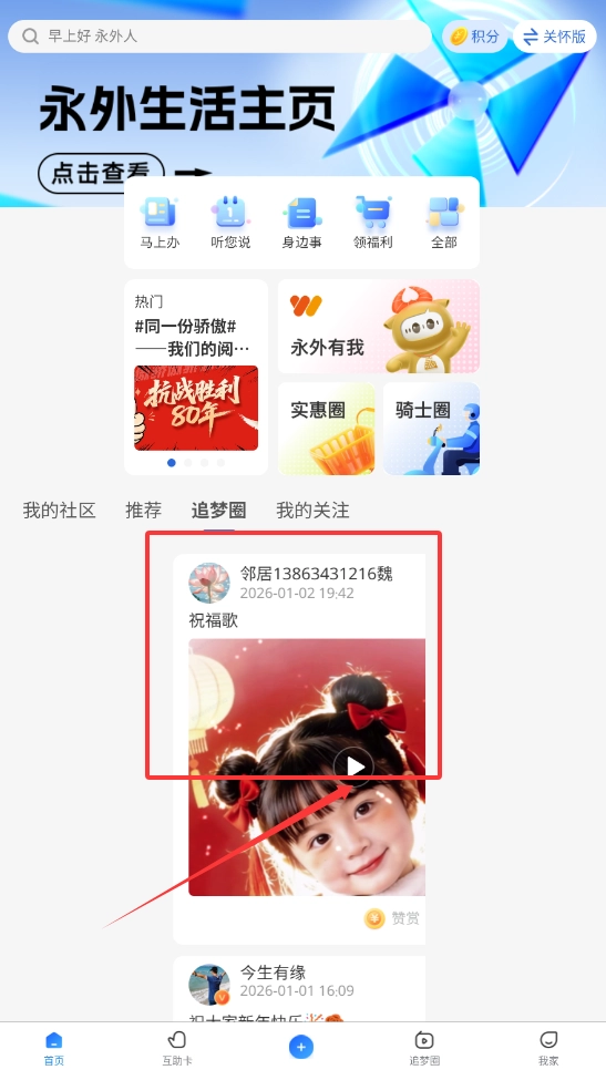 追梦永外深度服务于社区邻里关系的数字平台,成功地将线下社区的温暖与线上技术的便捷融为一体,它通过提供动态分享、互助支持、事务办理及活动参与等一系列核心功能,有效拉近了邻里距离,营造了互助友爱的社区文化。