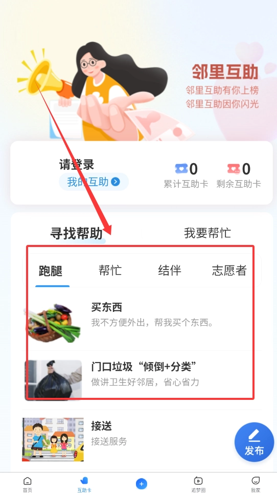 4、查看累计的互助卡数量,并根据需求选择“寻找帮助”发布跑腿、接送等具体请求,或者通过“我要帮忙”来回应邻居的需求。