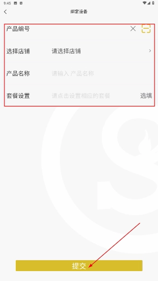 4、回到绑定设备页,填写【产品编号】【产品名称】等信息,选择对应店铺后点击【提交】完成绑定。