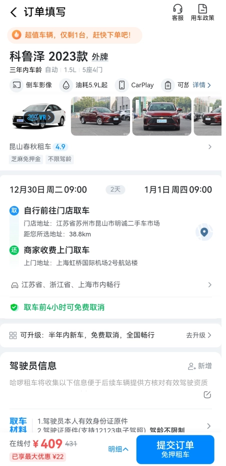 3、填写驾驶员相关信息,同时确认订单取车、还车的时间以及取还车方式等关键内容。确认无误后,即可直接提交订单,完成整个预订流程。