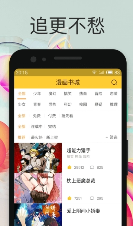 智能搜索与筛选功能:配备强劲的搜索工具,支持依据状态、类别等多个维度进行筛选,助力用户迅速找到喜爱的漫画。