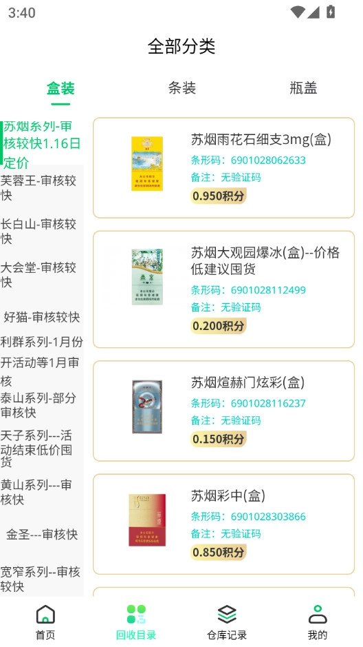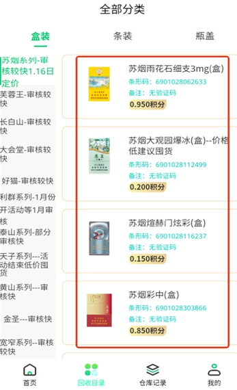 2、在回收目录功能栏中,可查看所有支持回收的烟盒所对应的回收积分。