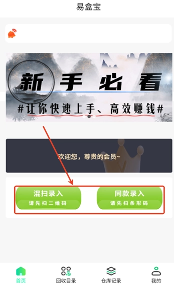 1、打开易盒宝后,在首页能看到“同款录入”与“混扫录入”这两种录入方式。