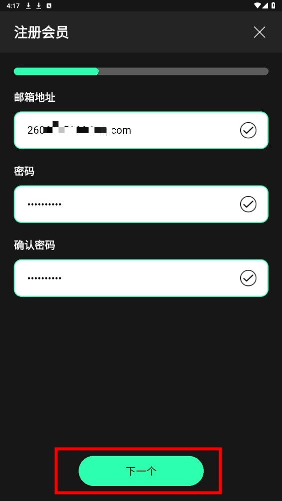 2、输入邮箱地址并设置密码,然后点击“下一个”。
