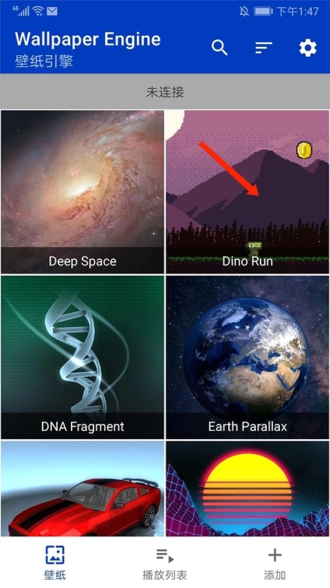 1、启动Wallpaper Engine手机应用,进入主界面后,通过滑动屏幕可以浏览各类壁纸,找到心仪的壁纸后点击它,