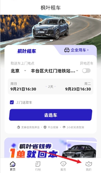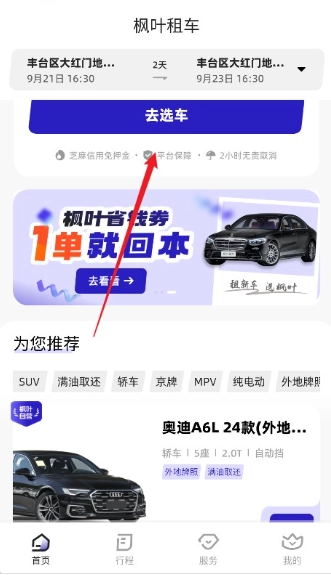 1、打开枫叶租车App,在首页填写你所需的取车时间、还车时间和取车地点,填好后确认提交。
