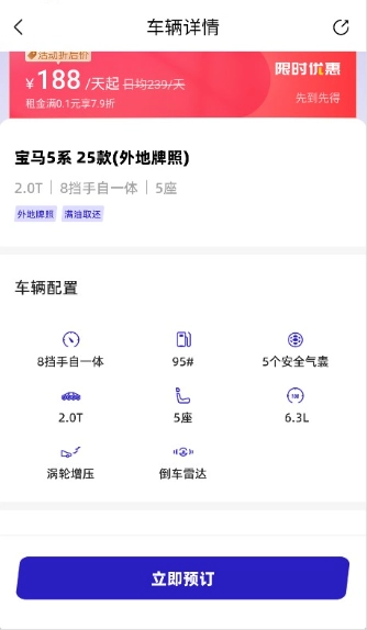 3、在选车页面点击任意车辆,即可查看该车型的配置详情、租赁价格、适用场景等信息,以便确认车辆是否符合你的需求。