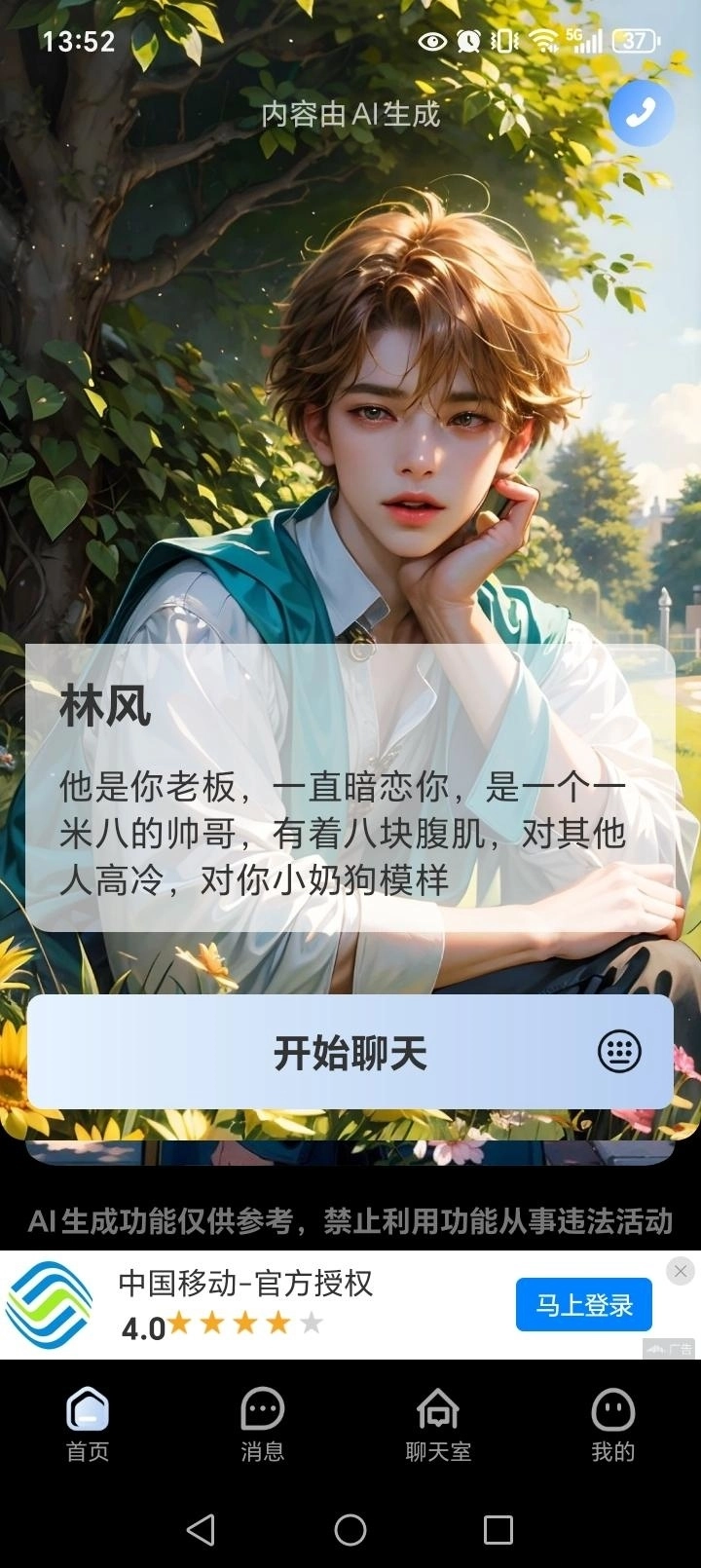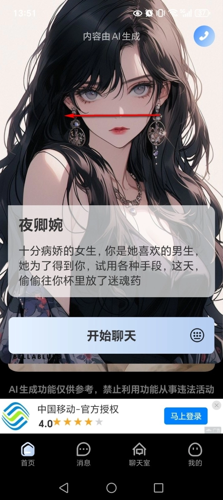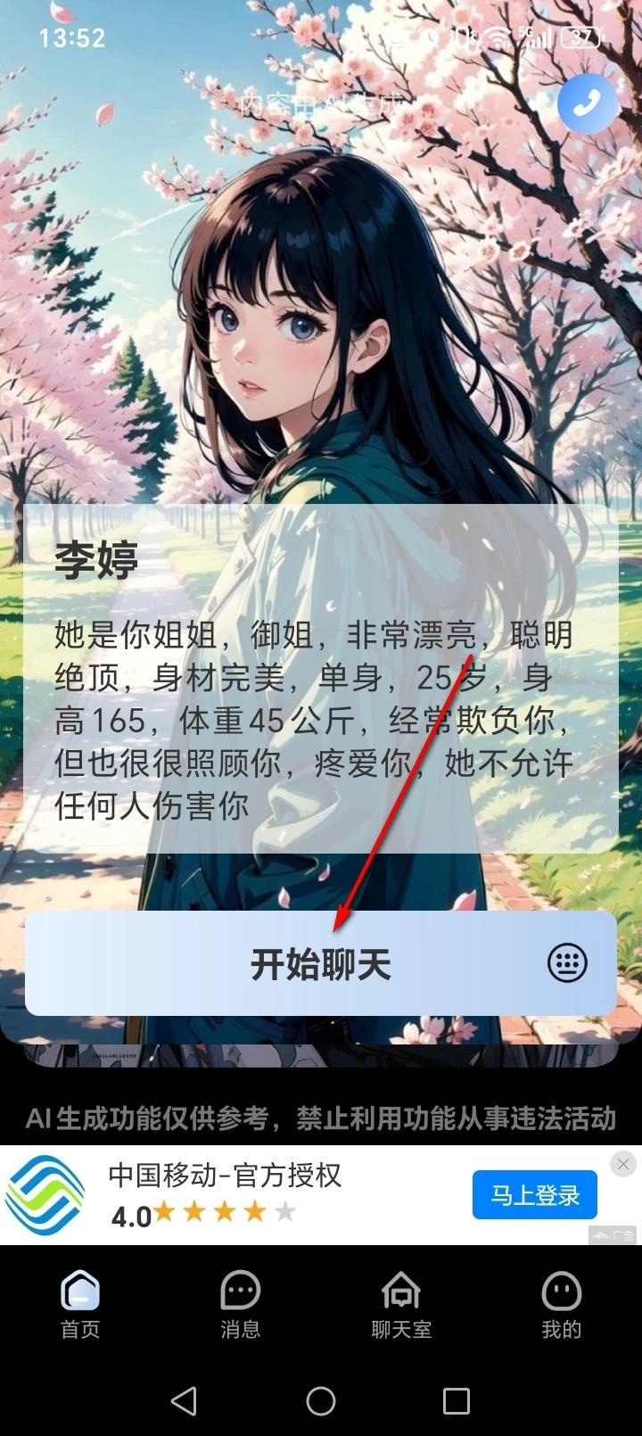 找到喜欢的AI角色后可以点击【开始聊天】去聊天