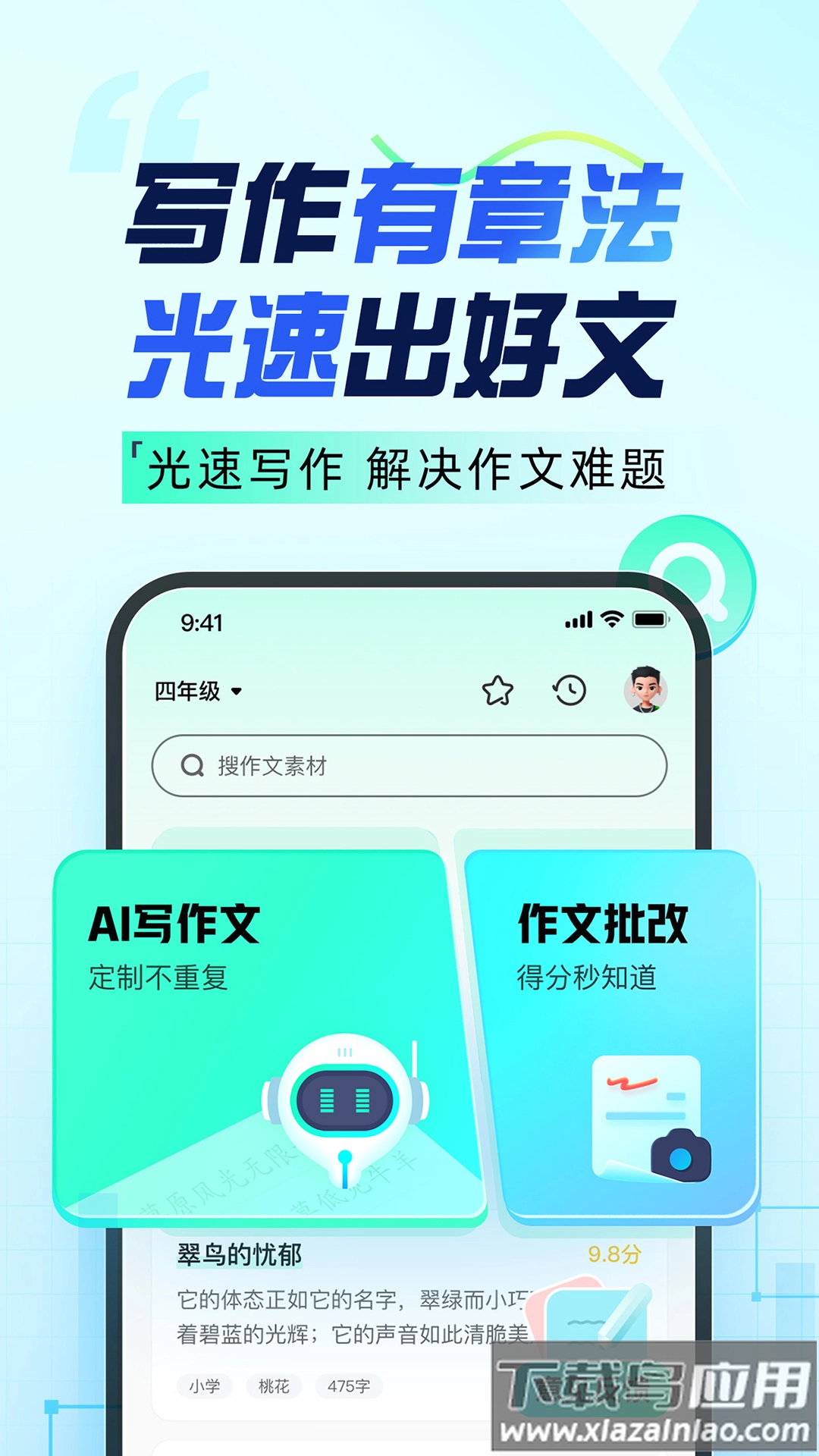 在写作时遭遇灵感匮乏或表达不畅是不少人的普遍难题,光速写作这款智能工具能为你带来切实可行的解决办法。它融合了AI批改与写作辅导功能,拥有海量优质范文资源,还支持实时错别字检查,让文字创作更高效省力;只需输入关键词,系统便会智能匹配相关作文范例、素材库和写作技巧,助力你迅速打破创作僵局。这款应用尤其适合学生和文字工作者,希望提升写作能力的朋友可以尝试体验一下。