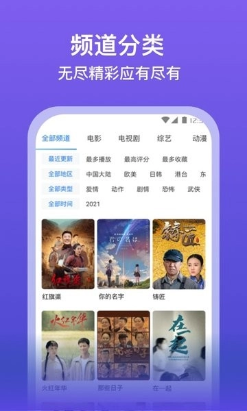 设置了电视剧、电影、少儿等12个垂直频道,每个分类下还设有年代、地区等细分标签。