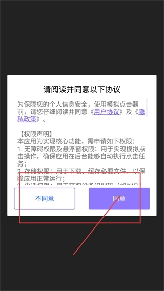 1、当应用启动弹出协议窗口时,仔细阅读《用户协议》《隐私政策》以及相关权限声明,随后点击【同意】按钮,就能进入模拟点击器的主界面。