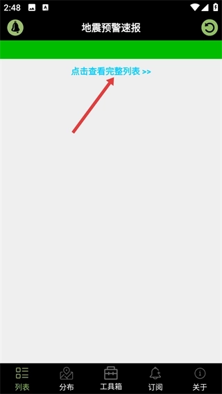1、在地震预警速报界面,点击“点击查看完整列表>>”选项,进入地震信息的完整列表页面。