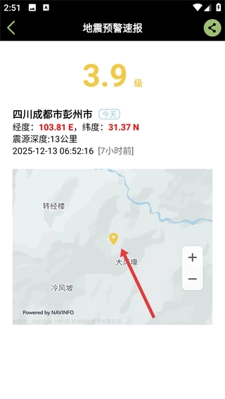 3、进入地震详情页面后,点击地图旁边的“+”按钮,将地图视图放大,以便查看更详细的位置信息。