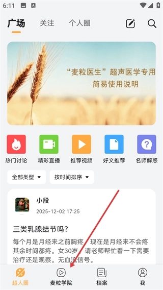 1、在【广场】页面点击底部的【麦粒学院】选项,就能进入医学相关的学习内容页面。