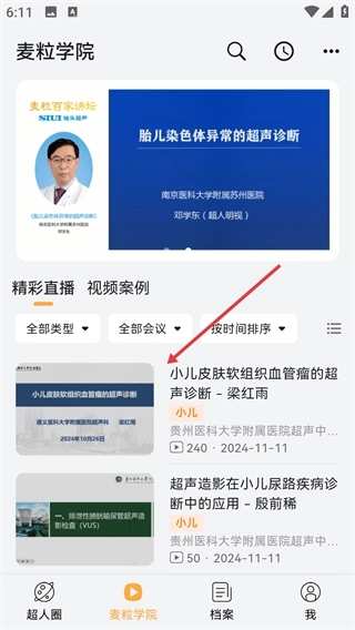进入【麦粒学院】后,找到【小儿皮肤软组织血管瘤的超声诊断】视频,点击进入其详情页面。