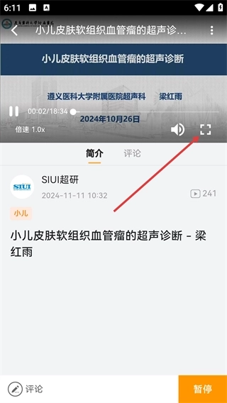 4、播放《小儿皮肤软组织血管瘤的超声诊断》视频时,点击全屏按钮能优化观看效果。