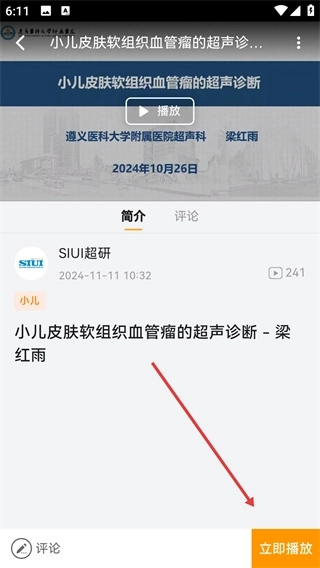 3、进入该视频的详情页面后,点击【立即播放】按钮,就能开始观看医学教学视频的内容了。