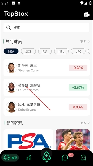 1、打开【TopStox】首页后,能借助【NBA】【足球】等分类浏览【热门球员】,点击想要查看的球员即可进入其详情页面。