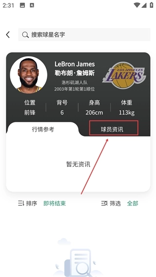 2、在球员详情页面,用户能够切换【行情参考】与【球员资讯】这两个标签,以此查看相应的信息内容,进而获取到该球员的相关动态。