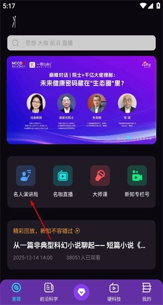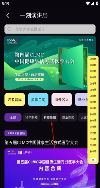 进入一刻演讲局页面后,能看到各类分类标签,从中选择科技新知标签,即可筛选出该类别下的演讲内容。