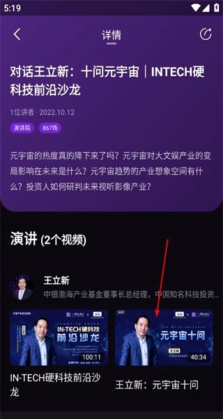 4、进入详情页面后,浏览演讲的相关介绍内容,找到对应的视频入口选项,即可选择观看相关的演讲视频。
