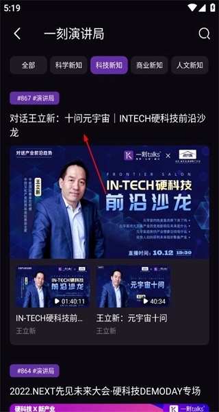 3、在科技新知分类里找到与王立新对话的演讲局相关内容,点击该内容进入详情页面。