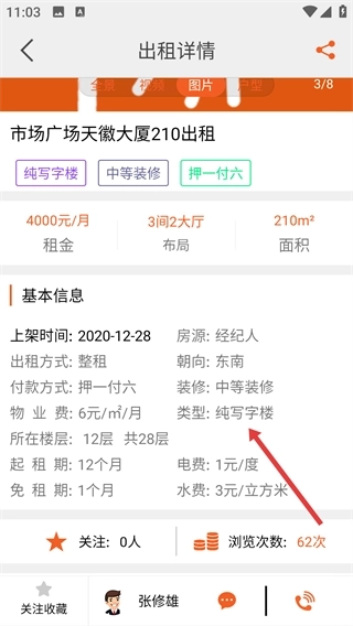 4、进入出租详情页面后,能够查看房源的租金、面积、装修等基本信息,了解该写字楼出租的详细内容。