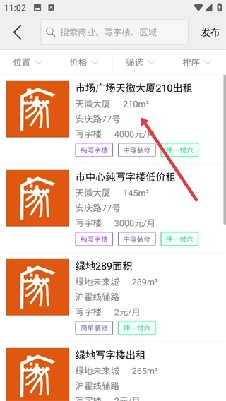 2、在商铺写字楼页面选择【写字楼出租】选项,进入对应的写字楼出租房源列表页面,查看相关房源信息。