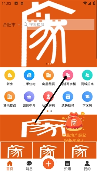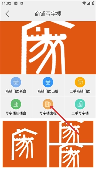 1、在首页点击【商铺写字楼】选项,即可进入商铺与写字楼相关的分类功能页面,该页面包含多种房产服务入口。