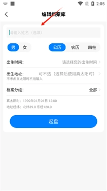 4、在线起盘需要输入姓名、出生时间和出生地址起盘