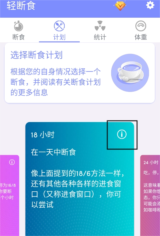 打开软件后,第一步是在计划栏里挑选一个符合自身身体状况的断食方案。这里有12小时、16小时等多种经过科学验证的计划可供选择,当然也能依据自己的实际情况定制专属计划。要是想了解某个计划的科学依据,只需点击该计划右上角的感叹号图标就行。
